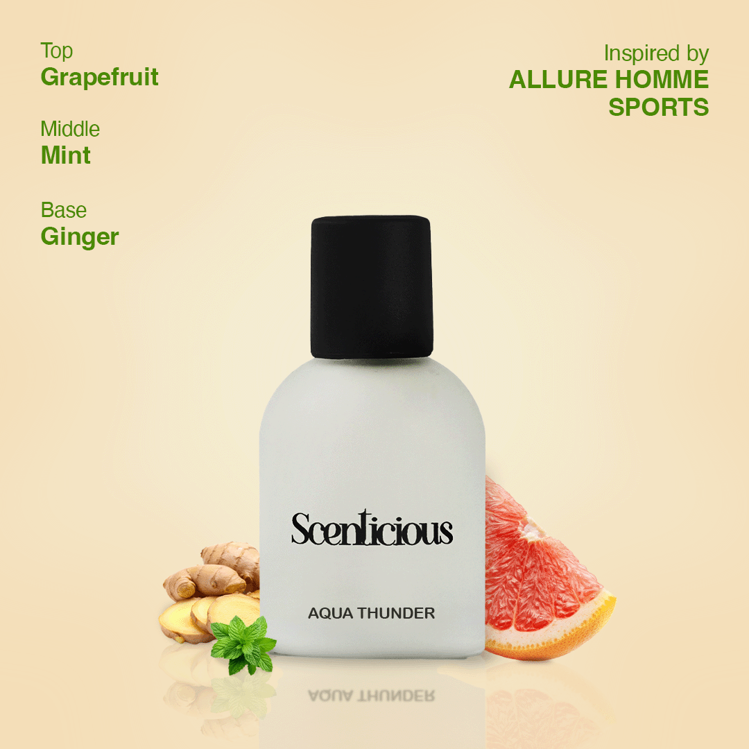 Inspired by the fresh and dynamic essence of Allure Homme Sport by Chanel, Aqua Thunder is a vibrant, energetic, and effortlessly masculine fragrance that captures the spirit of vitality and confidence. It opens with crisp citrus, juicy orange, and invigorating sea notes, creating an immediate burst of freshness and energy. The heart reveals spicy pepper, aquatic accords, and subtle floral hints, blending into a smooth, modern, and dynamic core. As it settles, the base unfolds into cedarwood, tonka bean, and warm musk, leaving a long-lasting, fresh, and commanding trail. Perfect for those who love fresh, sporty, and magnetic masculine scents. β‘ππΏ