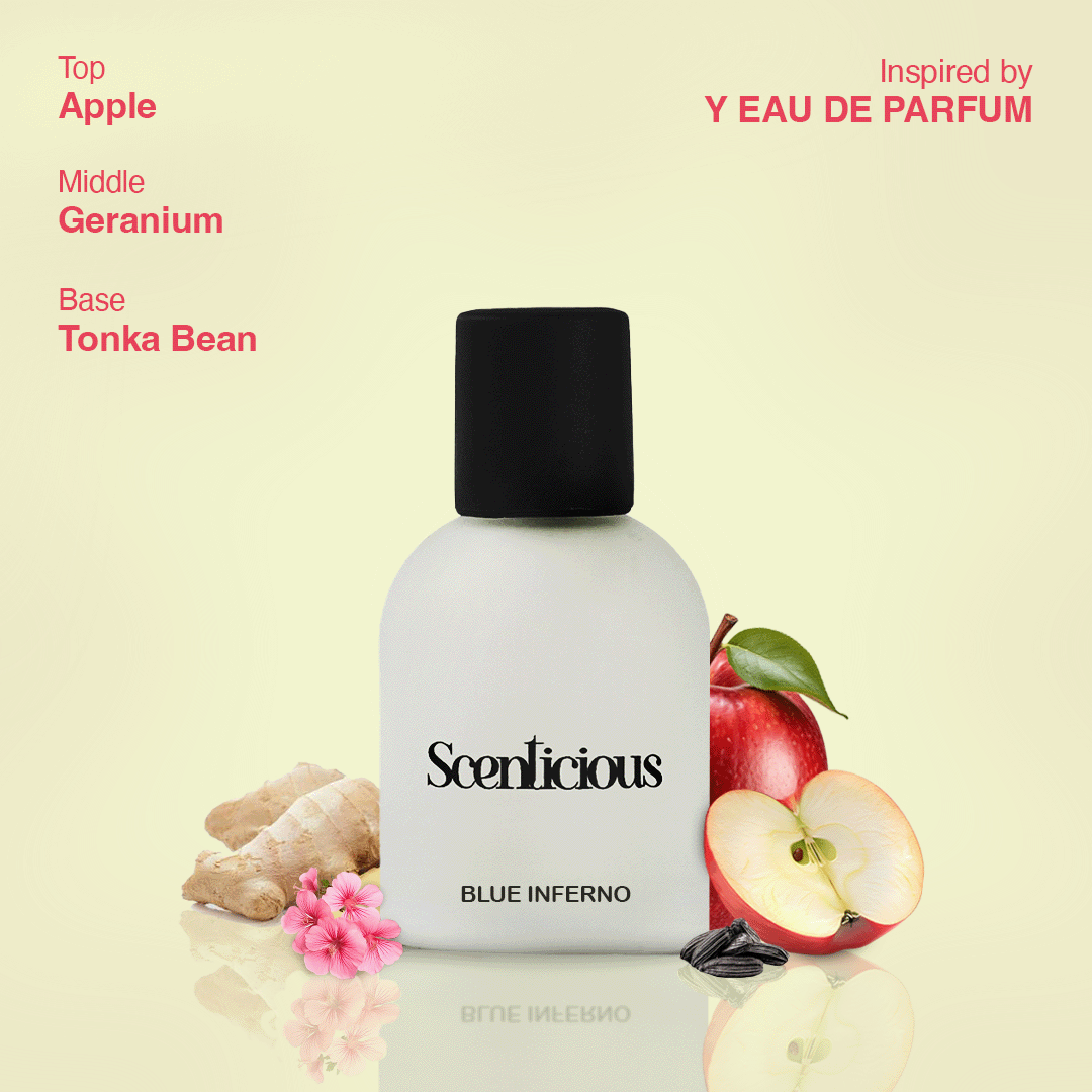 Inspired by YSL Y, Blue Inferno is a fresh, aromatic, and modern masculine fragrance with a crisp, vibrant character. It opens with bright notes of bergamot, apple, and ginger, bringing a clean burst of freshness. The heart blends sage, juniper berries, and geranium for a smooth, herbal depth. Finally, warm base notes of amberwood, tonka bean, and cedar create a long-lasting, confident trail. Perfect for those who love bold, clean, and stylishly modern fragrances. ✨💛