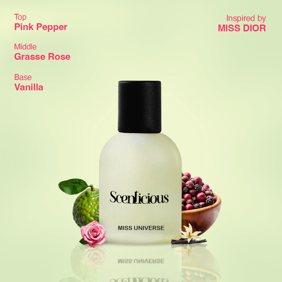 Inspired by the timeless elegance of Miss Dior, Miss Universe is a romantic, feminine, and gracefully sophisticated fragrance that feels like a bouquet of freshly picked flowers in full bloom. It opens with bright citrus, sweet orange, and delicate rose notes, creating an instantly uplifting and charming aura. The heart reveals jasmine, peony, and soft floral accords, blending into a smooth, elegant core that feels luxurious and effortlessly refined. As it settles, the base unveils patchouli, warm musk, and subtle vanilla, leaving a long-lasting, soft, and enchanting trail that is delicate, romantic, and undeniably classy. Perfect for those who love fresh, floral, and elegantly feminine scents. 🌸✨💖