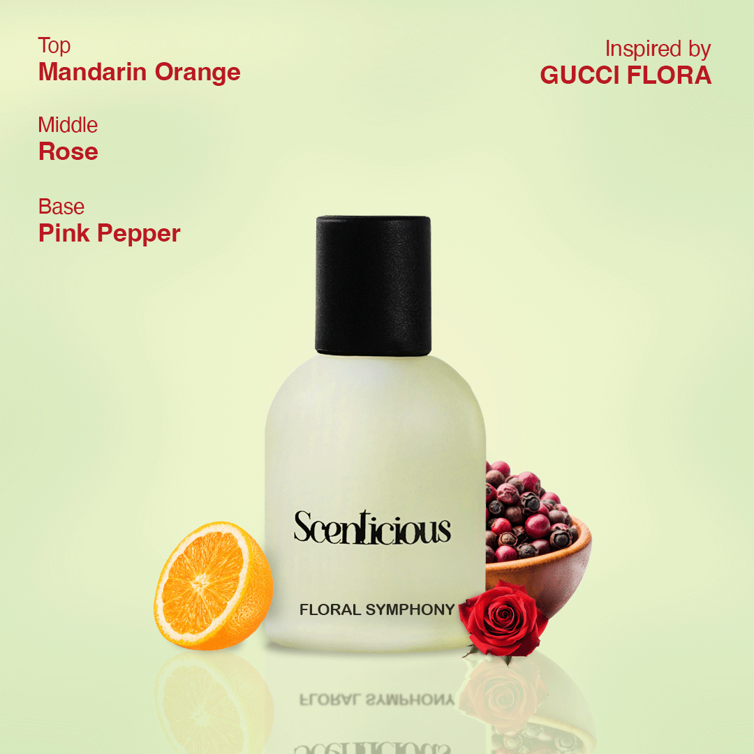 Inspired by the elegant charm of Flora by Gucci, Floral Symphony is a bright, floral, and gracefully feminine fragrance that embodies timeless sophistication. It opens with fresh citrus, sweet peony, and delicate mandarin, creating an immediate sense of freshness and vitality. The heart reveals rose, osmanthus, and soft floral accords, blending into a harmonious, luxurious, and uplifting core. As it settles, the base unfolds into patchouli, sandalwood, and warm musk, leaving a long-lasting, refined, and enchanting trail. Perfect for those who love fresh, elegant, and romantically floral scents. 🌸✨💛